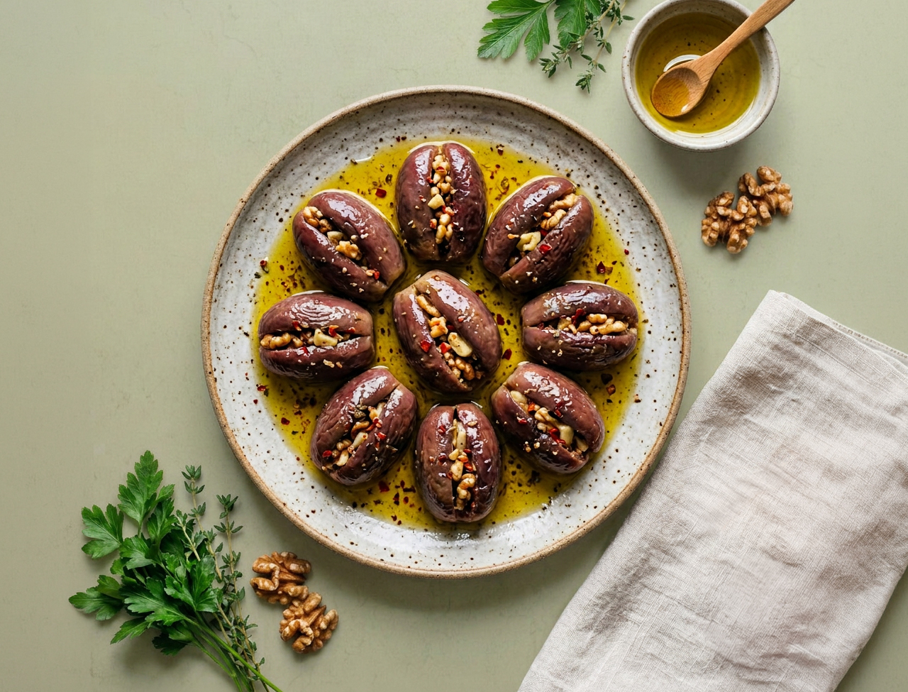 المقدوس من أشهر الأطباق التقليدية في المطبخ الأردني، ويُحضَّر من باذنجان طازج محشو بالجوز والثوم ومغمور بزيت الزيتون البلدي. في مطبخ اماني نحضّر المقدوس بطريقة منزلية تعطيه طعمًا غنيًا وقوامًا مميزًا، ليكون إضافة لذيذة على مائدة الفطور أو العشاء.